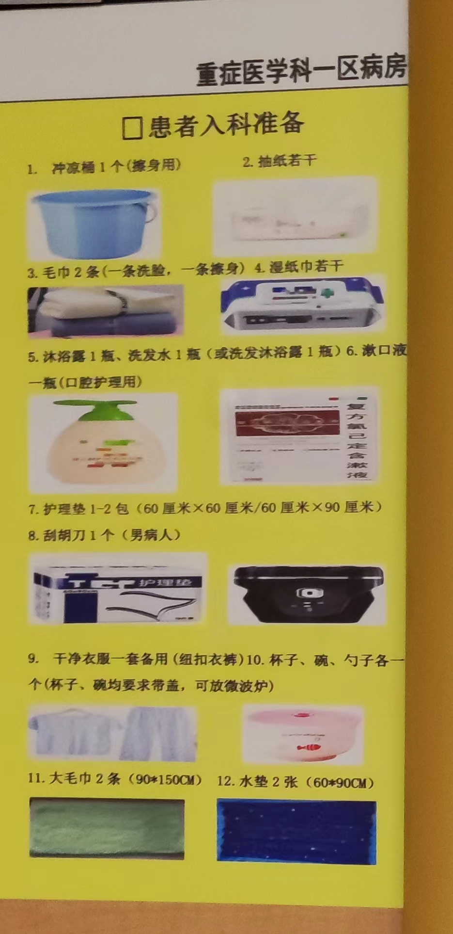 **要准备这些,主要是一个桶、毛巾、抽纸、湿巾、漱口水、护理垫、沐浴露、干净的睡衣、带勺子的碗,我还放了一个剃须刀进去。