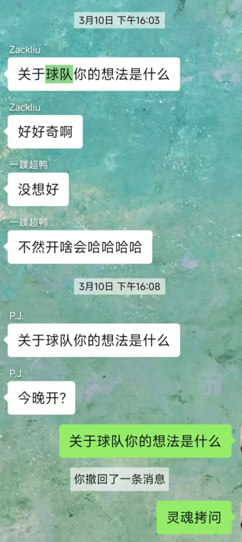于是在越山队友群,这个男的被我们称作下头男了。豪白白那边是打慢垒的,下头男当着豪白白说慢垒是老年人玩的。这也太没礼貌了,而且一定要约棒球,还要打硬球,明明自己也是新人来的。豪白白脾气真是好,这都能接比赛。要我不接了,谁要跟下头男比赛,感觉能变成黑历史。